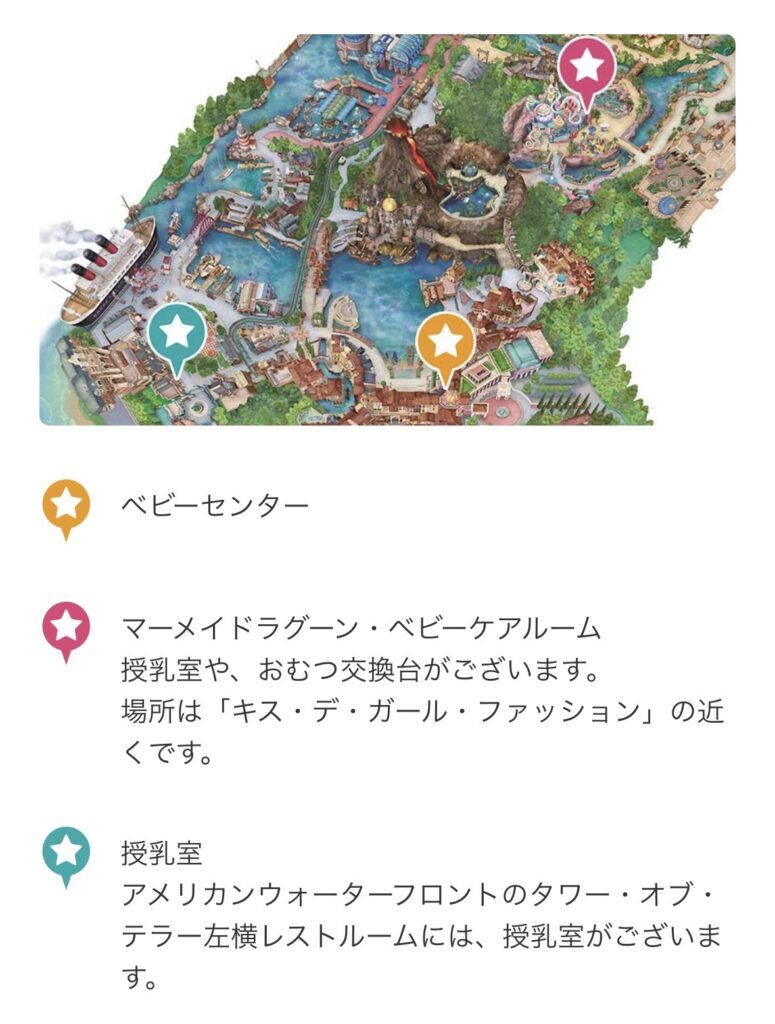 ここがシーで一番大きな拠点。入園してすぐ「とりあえずオムツ替えてから出発!」という時に最適です。お湯の提供や離乳食スペースも完備されています。